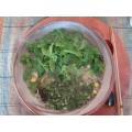 ルッコラ、収穫しました。昼ラーメントッピング、左からシカクマメ、ゴーヤ、ナスです。
