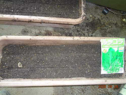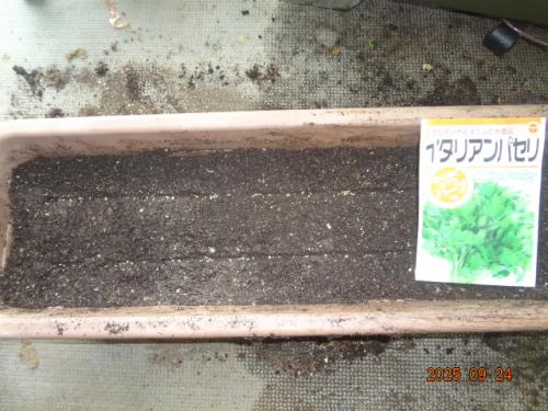 イタリアンパセリ、ルッコラ、本日播種しました。2筋播きです。