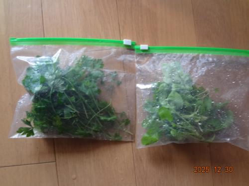 ルッコラ、イタリアンパセリ、収穫しました。今日から帰省、福知山正月持ち帰り用。