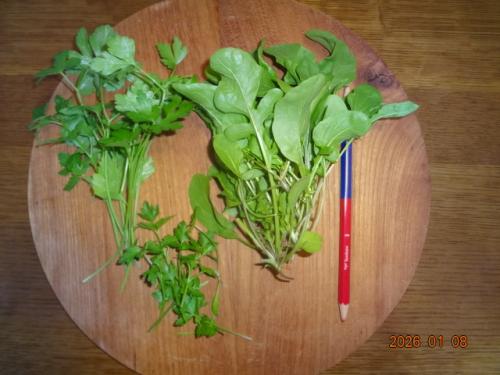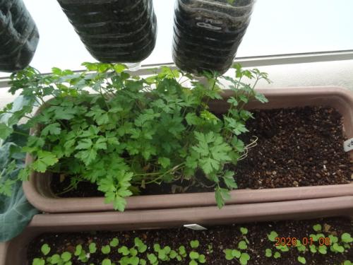 イタリアンパセリとルッコラ、収穫しました。イタリアンパセリは播種106日目、ルッコラは播種60日目です。次のイタリアンパセリを空いたスペースに播種。5日目です。