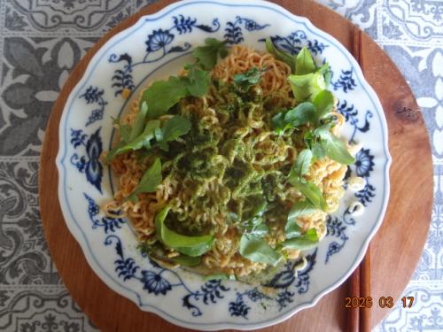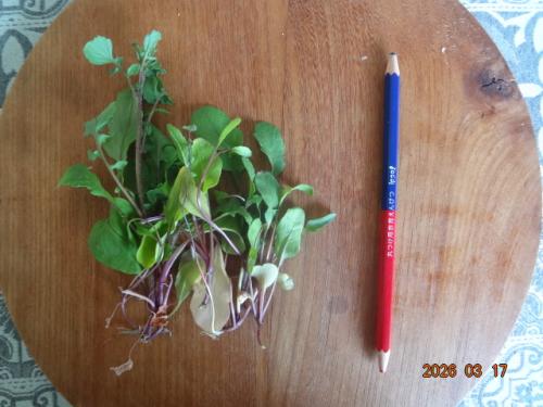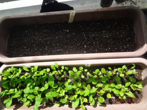 ルッコラ、本日撤収、播種しました。撤収は92日目です。焼きそばにトッピングしていただきました。隣のプランターは2月6日に播種したもので39日目です。