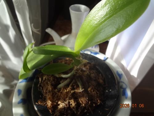 コチョウランミニ、花芽が出ません。昨年の転落事故で葉を負傷、ようやく新しい葉が出てきたところです。今年、花は無理かな。