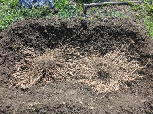 仕方ないのでショベルでざっくりやっちゃった株を諦めて2つ植え替えた。