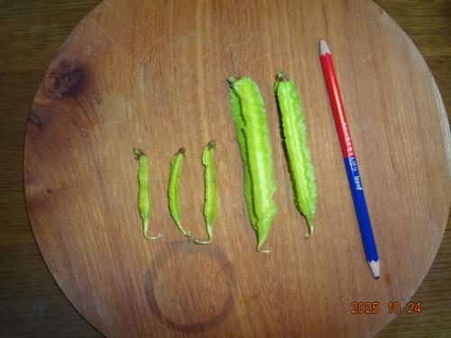 シカクマメ、5個収穫、累計11個。10㎝の長さでちょうど、3個ほど小さく早すぎました。