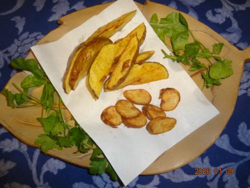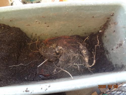 シカクマメ、根塊を発見しました。ジャガイモ用にプランターの土を作りなおそうと掘ると固い根塊が出てきました。根っこも食べられるようなので妻に相談、レッドムーンと一緒にとりあえず1個揚げました。ナッツのような味で揚げたらいけます。