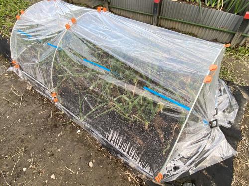 発酵鶏糞を散布して灌水。 ビニールトンネル設置して防寒対策しました。