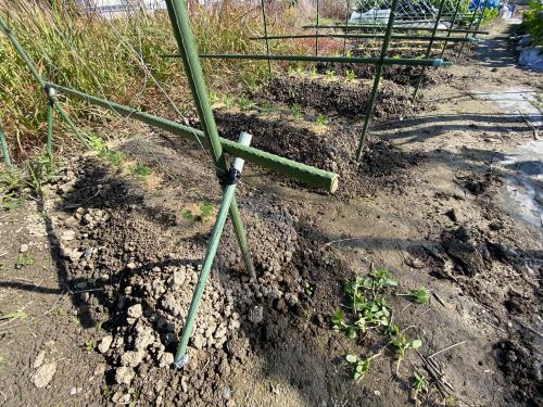 一穴に3株育ってるものは、二株に間引きました。 防寒対策の不識布を張る準備もしときました。
