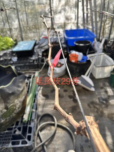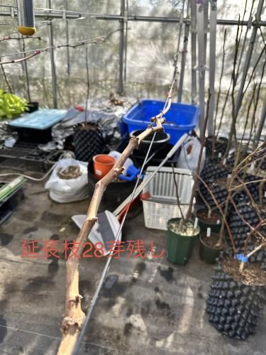 主枝2本なので一番場所を取っているバイオレットキング。 短梢16枝、延長枝57節。 去年は植替えもあったので花芽がほぼ無し。 今年は短梢、長梢共にあるので花芽の付き方が比べられそう。
