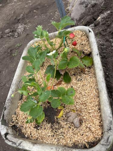 ハウスの中ではプランターに移植した苺が赤くなりはじめました。 小粒だけど甘くて美味しい。 ワンコと散歩がてらに畑の見回り、ご褒美にワンコと半分こしてます。