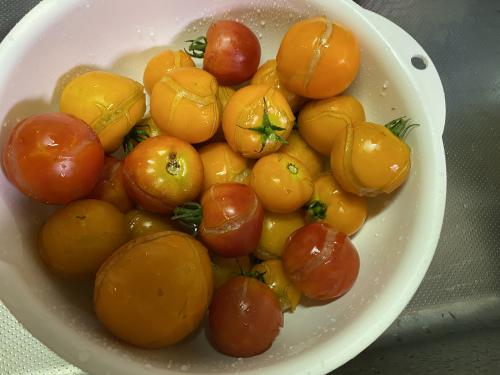 梅雨らしい梅雨も無く、長い猛暑続きで、株が弱ってます。 乾いてるのに実が割れたりもして、もう綺麗な収穫が出来ず。 近年は夏越しが出来ないトマト。そろそろ終わろうかな。。。