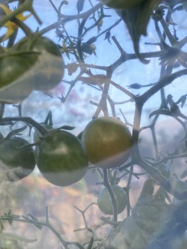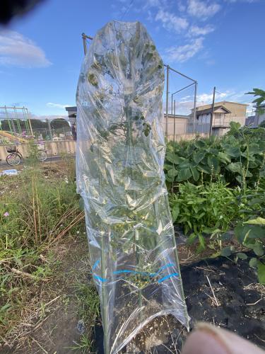 着果が色付いてきましたよ╰(*´︶`*)╯♡ 秋らしい気温低下が始まったので、 ビニールで覆って、かつ台風影響の大風対策に支柱補強しました。