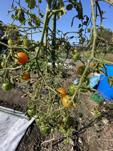 枯れるまで放置作戦の挿し木ミニトマト株です(笑 ほんのりと色付いた10個ほど収穫しました(^。^);