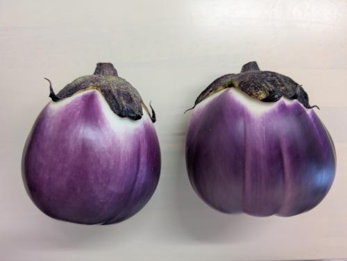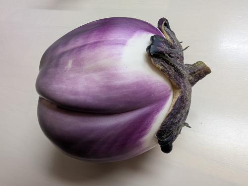 初収穫 日本のナスより皮は少しかたい 皮をむいてオリーブ油で炒め 塩コショウで味付けするだけで たしかに満足度高し