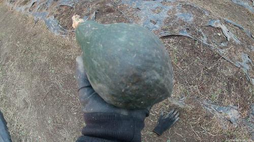 昨日の続き作業・・ 旧 路地栽培ロロンカボチャ畝の枯れた雑草を除去して 片付け完了しました! 最後の残党カボチャ1個を収穫しています