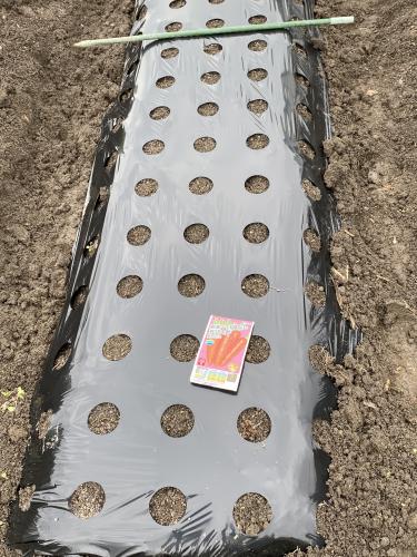 時期的に拙速かと思いつつ、午後からの降雨予報もあって、 播種決行しました。 一穴2粒撒きで籾殻を被せ不識布で覆いました。 、、、大根と同じ畝のお隣さんです。