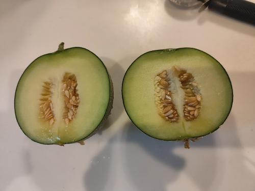 第二期のパンナを食べました。 硬いメロンですが、中心部は、甘いです。 糖度は、12くらい有りました。 意外と食えます。16玉処分しなくて良さそうです。
