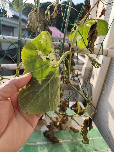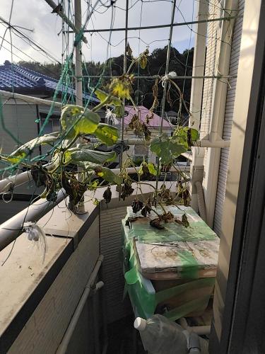 南側のベランダで栽培しているメロンですが、寒さとポンプ故障でメロンが枯れました。 株を撤去します。 ウリノメイガに食害されてます。 これで今年のメロン栽培は、全て終了となります。
