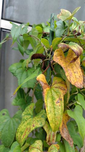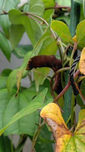 ドキドキしながら眺める山芋のツル あっ いた クソー随分大きく育っている。 葉っぱをもりもり食べたな。 ピンセットで挟んで 瓶に入れた。 手が震える。 イヤだなー これホントにイヤ。 去年 葉っぱを食べ尽くされたので毎日気をつけて見てるけど、大きくなるまで気がつかないのが悔しい。
