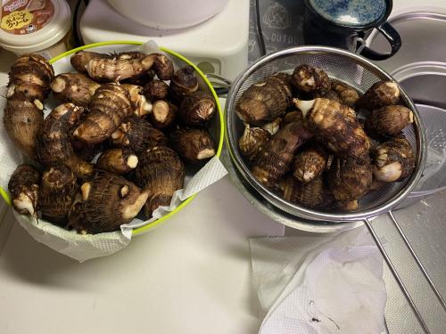 昨日の試し掘りは職場の方へ配ったので、また2株掘ってみる。 前回のよりも小さい子芋が多く、細々して洗うのが面倒だったw。 とは言え、大ボウル1.5杯分位の量にはなったので、良しとする。 チビ芋たちはさっそく「豚汁」に入れてみる。美味しかったー♡