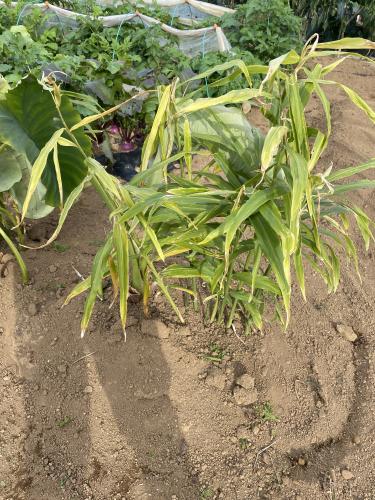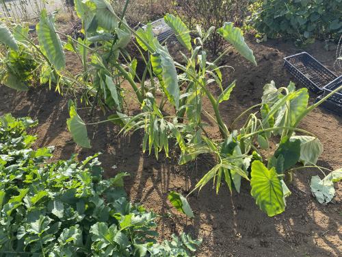 いい加減掘り上げないとと思いつつ、そのままの里芋(親種芋畝)たち。