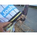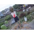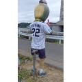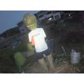 菜園作業の合間にハロウィン案山子に昨日届いたユニフォームを着せた後