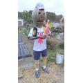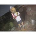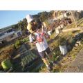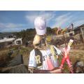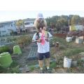 菜園作業の合間にハロウィン案山子に昨日届いたユニフォームを着せた後