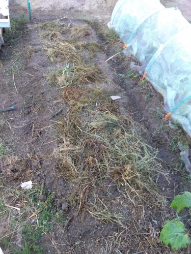 株元で切り落とし、根っこを引っこ抜き(根っこはとても綺麗でした。健全そのもの)植えていたところに溝を広めに掘り、そこにオクラの茎葉と根っこを切らずに投入(邪魔くさい)、足で踏み固め、窒素分の供給は後作がタマネギだから硫黄分が欲しいと思い油粕を使わずに硫安をチョイス。規定量をパラパラ振りかけて、倉庫に残っていた腐葉土を投入、ラクトヒロックスを水に溶かしたものをジョウロでまんべんなくかけてから、掘り出した土に有機石灰を混ぜて埋め戻し、簡単に畝立てしました、最後に雑草マルチをして軽く水やりしました。