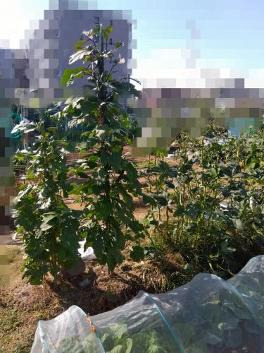 ナス全景。 左側がとろ〜り旨ナス、右側が飛天長。 垂直仕立てしているために背が高くなっており、自分の背丈を軽く超えています。しかし、収量は少なかった。やはり来年以降はPC筑陽に戻そう。変なナスもやめよう。