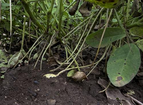 中心近くでは落花生ができている。 上にある葉は微妙に黄色くなり枯れ始めている。 次から次へと花芽から地面に芽が伸びている。