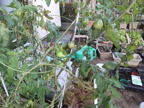 うす皮トマトの6月に挿し芽をしてプランターに植え付けた分、 花が咲いても実が付かなかったが、今頃付き出した。 赤くなるのかな?