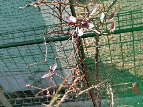 枯れたような枝にぷっくりと花芽があらわれた。 左端のミスティには全部でたった10個。 右のミスティには0 真ん中のサンシャインブルーにはたくさんの花芽がある。 今年はミスティがお休みの年だな。 サンシャインブルーは花がびっしり咲く種類だから、今年も3割くらいは摘花しようと思う。