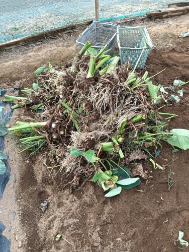 ちょっと早いですが里芋を掘りました 結果だと収量は少なめ やっぱ、夏が暑すぎで雨不足が原因ですね ここの畝は耕耘して明日にはニンニクの畝に なります