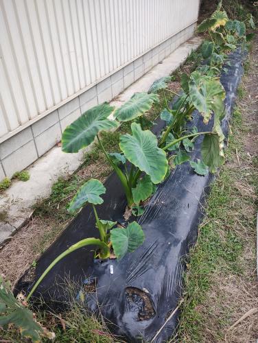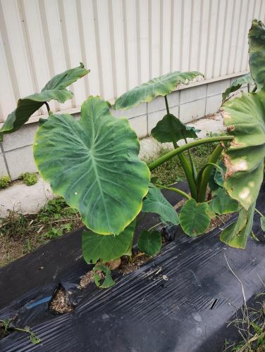 土垂(サトイモ)の傷んだ葉を摘葉しました。