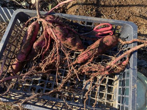 サツマイモ「紅あずま」、4株収穫! うち、2株には何も出来てなかったw 4本位は食べれそうなので、良しとする。