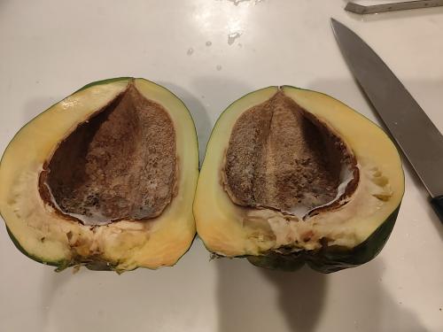 昨年収穫したパパイヤを切りました。 残念ながら、中がカビていました。 黄色くなり始めでした。