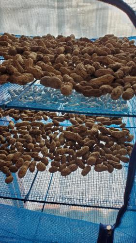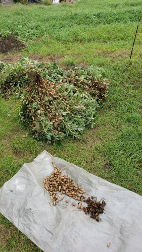 うり坊が、電柵をくぐり抜け、入り込み食べた後がありましたら 1/3程堀上げて第1回目の乾燥作業をすることにしました まだまだ開花しているものもあり、早いような気もしましたが、うり坊との争いもあるので早めの収穫で~す 種苗会社の栽培マニュアルでは、葉が枯れて来たらと有りますが、周りの方々も早めの収穫をしています 実の付がまあまあ良いので、それはそれで良いのでしょう 干す場所はないので、干しがごで乾燥工程に入りました