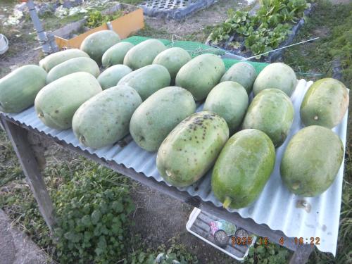 使えそうなトウガンを全てしました→職場用 ひ弱苗を譲り受け栽培開始 全くのほったらかしで大量収穫出来ました! 総収穫量は約100個です