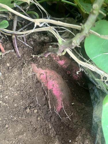 1箇所掘ってみました。 活着が遅れた箇所なので、芋の肥大はもう少し欲しいところ。