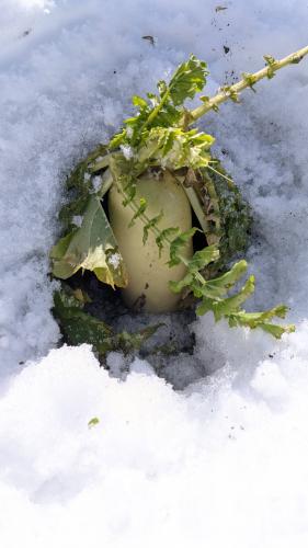 寒気が抜けて雪は今後溶けるばかりの気温推移。白い雪を掘って大根を収穫しました。あと何本残っているやら。無駄無く消費しきれるか。