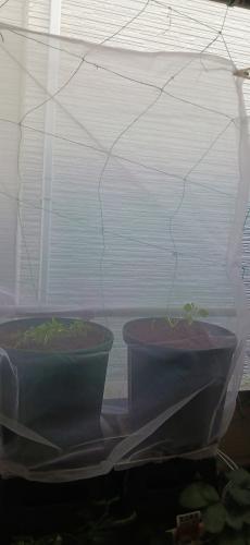 なんかちょうどいいネットないかと 思案して裁縫苦手やけどなんか作ろうかしらと思ってたらAmazonで買った 80×80と80×100の大きなネットあるの を2階ベランダは網が張ってあるのでそれを洗濯バサミで高く摘まんでみたら いいじゃな~い(≧ω≦。) 薄目で日当たりもいいいし~