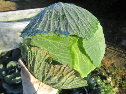霜が降りるようになったので不織布を掛けました。 キャベツにも霜が付いています。