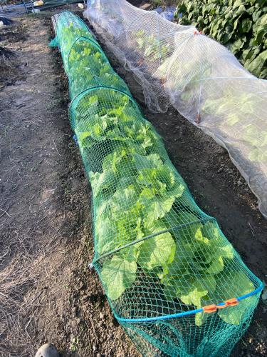 CRお黄にいりの背丈が伸びてトンネルに仕えてきたので、 ネットを変更しました。 同時に発酵鶏糞を株元に散布しました。