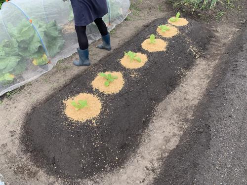 40cm間隔で6株定植しました。 畑には事前に苦土石灰と熟成牛糞、黒土を加えて、「こまめちゃん」でよく耕しています。 化成肥料を加えるのを忘れたため、液肥を加えた水を撒いておきました。