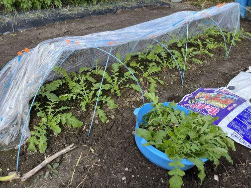 桜の砦の本葉が6枚以上になったので、 間引きして一株にしました。 化成888を追肥して土寄せしました。