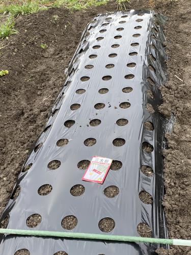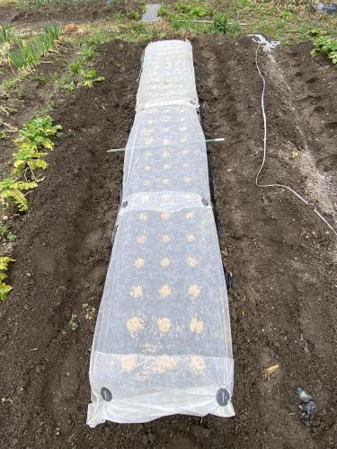 時期的に拙速かと思いつつ、午後からの降雨予報もあって、 播種決行しました。 一穴3粒撒きで籾殻を被せ不識布で覆いました。 、、、ニンジンと同じ畝のお隣さんです。