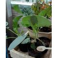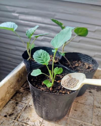 ブロッコリー夢ひびき。 定植までこの黒ポットでいこうかな。 化成肥料を少し埋めた。