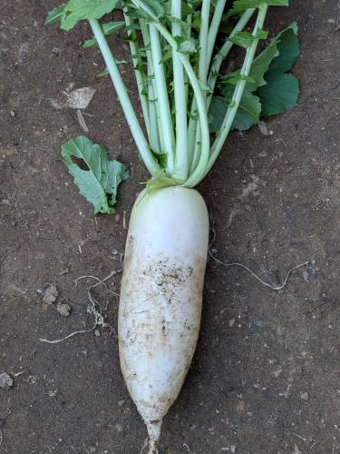 今晩のお味噌汁用に三太郎ダイコン1本収穫しました。