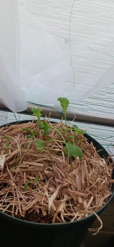 ベランダのあまりにも徒長した大根 もう土増しできるスペースないので 苦肉の策で敷藁を。2本は徒長してないから。それを育てるしかないかもですが あがいてみました(≧ω≦。)