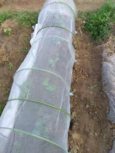 ブロッコリーにゼンターリとダインの混合液を防虫ネットの上からスプレーしました。