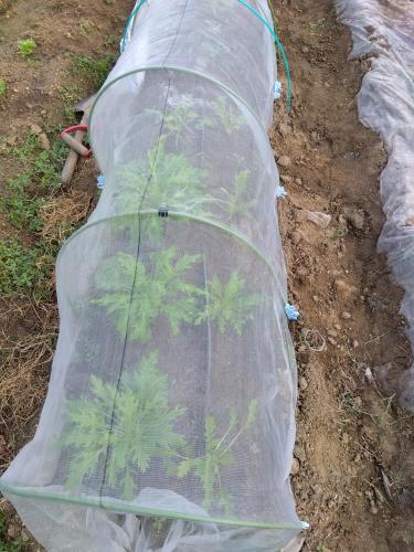水菜にゼンターリとダインの混合液を防虫ネットの上からスプレーしました。